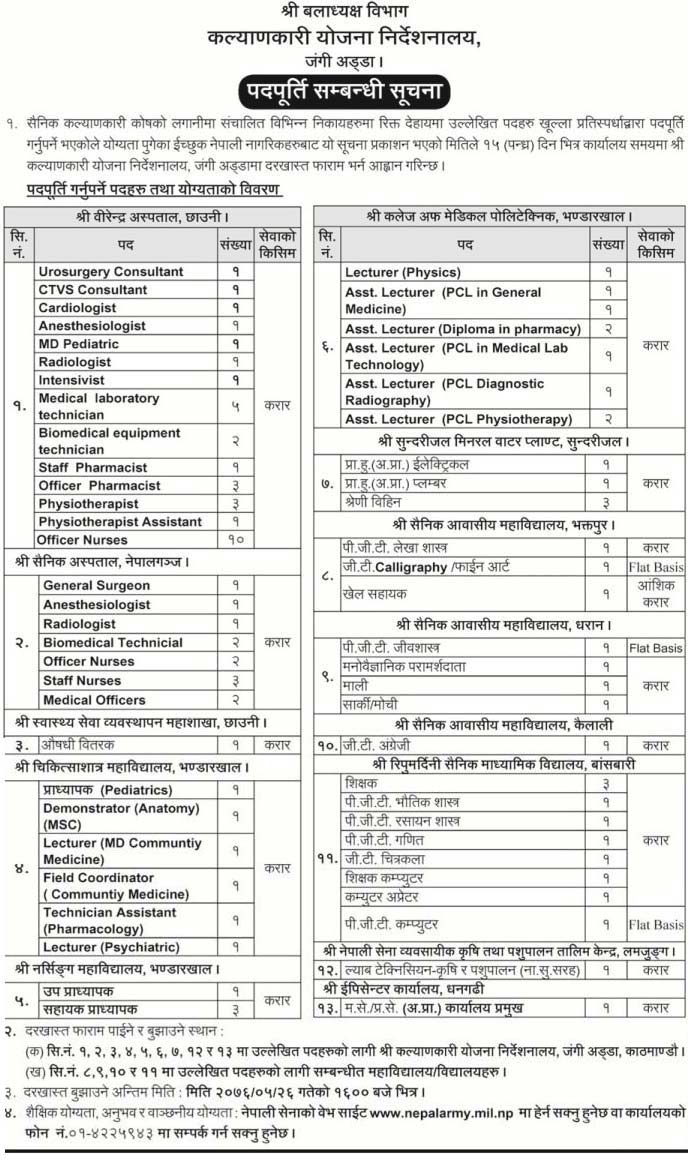 दरखास्त आजबाट १५ दिन भित्र दिइसक्नु पर्नेछ । दरखास्त मेडिकलको लागी श्री कल्याणकारी योजना निर्देशनालय, जंगी अड्डा तथा विद्यालयहरुको लागी सम्बन्धित विद्यालय बाट पाइने सुचनामा जनाइएको छ ।