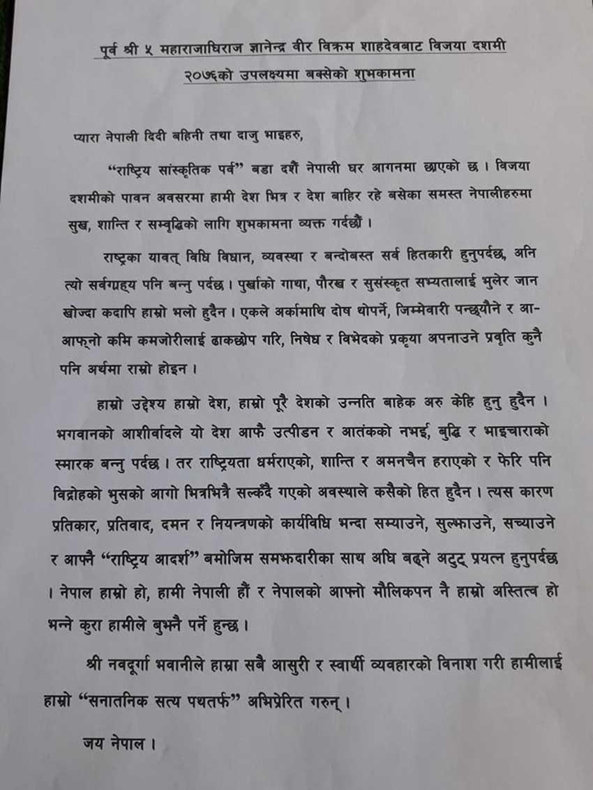 राजनीतिक दलहरुतर्फ संकेत गर्दै पूर्व राजाले पूर्खाको गाथा, पौरख र सुसंस्कृत सभ्यतालाई भुलेर जान खोज्दा कदापि भलो नहुने उल्लेख गरेका छन् । उनले सन्देशमा लेखेका छन्, ‘नेपाल हाम्रो हो, हामी नेपाली हौं र नेपालको आफ्नो मौलिकपन नै हाम्रो अस्तित्व हो भन्ने कुरा हामीले बुझ्नै पर्ने हुन्छ ।’पूर्व राजाले नवदुर्गा भवानीलाई सम्झँदै कडा शब्दमा लेखेका छन्, ‘श्री नवदुर्गा भवानीले हाम्रा सबै आसुरी र स्वार्थी व्यवहारको विनाश गरी हामीलाई हाम्रो सनातनिक सत्य पथतर्फ अभिप्रेरित गरुन् ।’