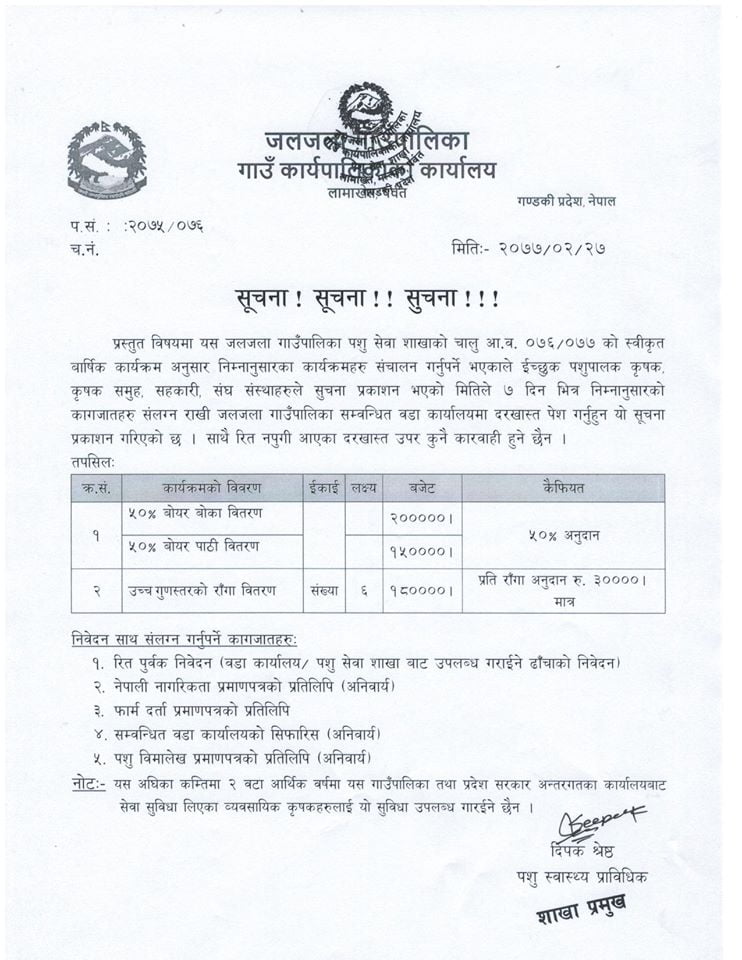 पर्वत। जलजला गाउँपालिकाले चालु आर्थिक वर्ष ७६ /७७ को स्वीकृत कार्यक्रम अन्र्तगत विभिन्न कृषि कार्यक्रम संचालन गर्ने भएको छ । यसका लागि गाउँपालिकाले एक सूचना प्रकाशित गरी कार्यक्रममा सहभागि हुन ईच्छुक पशुपालक कृषक, कृषक समूह, कृषि सहकारी,संघ संस्थालाई सूचना प्रकाशित भएको ७ दिन भित्र आवश्यक कागजातहरु सहित निवेदन पेश गर्न आव्हान गरेको छ ।