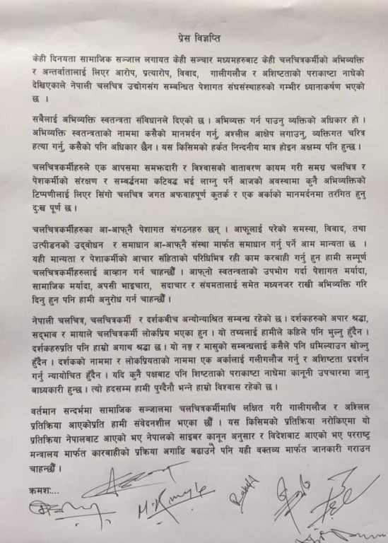 कुनै अभिव्यक्तिको टिप्पणीलाई लिएर सिंगो चलचित्र जगत अफवाहपूर्ण कुतर्क र एकअर्काको मानमर्दन हुनु दुस्खपूर्ण रहेको वक्तव्यमा उल्लेख गरिएको छ ।