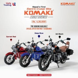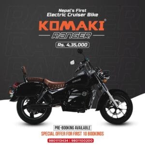 काठमाडौं – भारतीयमा लन्च भई सकेको इलेक्ट्रिक बाइक कोमाकी रेन्जर नेपाली बजारमा पनि आउने भएको छ ।   युनिटी ट्रेडिङ कन्सर्नले उक्त बाइक  भित्र्याउने बताएको छ । युनिटी ट्रेडिङ कन्सर्नले कोमाकीका इलेक्ट्रिक स्कुटर भित्र्याइसकेको छ ।