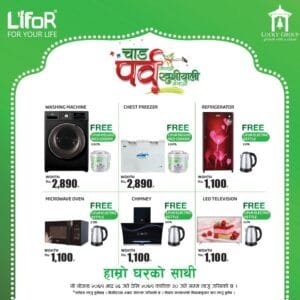 लाईफर वासिंग मेशिन र चेष्ट फ्रिजर को खरिदमा डिलक्स राइस कूकर र टेलिभिजन, रेफ्रिजेनेटर, माइक्रो ओभन चिम्नि को खरिदमा इलेक्ट्रिक केटल रहेको कम्पनिले जनाएको छ ।