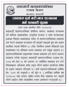 काठमाडौँ । संघ र प्रदेश सरकारबाट इजाजत लिई व्यवसाय गरिरहेकाहरूले पनि काठमाडौं महानगरपालिकाबाट व्यवसाय दर्ता गरी सञ्चालन गर्नुपर्ने भएको छ। महानगरको बबरमहलस्थित राजश्व विभागले सूचना जारी गरेर महानगर क्षेत्रभित्र व्यापार व्यवसाय सञ्चालन गर्ने कतिपय व्यवसायीहरूले संघ र प्रदेश सरकारबाट इजाजत लिएको तर महानगरबाट अनुमति नलिइएको पाइएको उल्लेख गरेको छ।