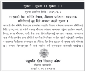 काठमाडौँ । काठमाडौंस्थित गौशाला धर्मशालामा मापदण्डविपरीत बनाइएका संरचना ३५ दिनभित्र हटाउनुपर्ने भएको छ। पशुपति क्षेत्र विकास कोषले सम्झौता विपरीत संरचना बनेकोले हटाउन समय दिएको हो। कोषले मारवाडी सेवा समिति नेपाल र गौशाला धर्मशाला सञ्चालक समितिलाई मापदण्डविपरीत बनेका संरचना हटाउन आग्रह गरेको हो।