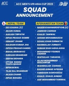 सोमबार एसियाली क्रिकेट काउन्सिल (एसीसी) ले यू–१९ एसिया कप खेल्ने नेपाल र अफगानस्तानको टिम सार्वजनिक गरेको हो ।