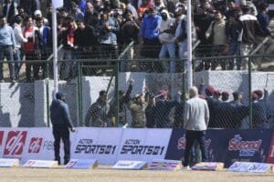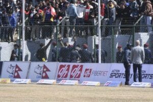 नेपालले ४७ ओभरको खेल चलिरहँदा ७ विकेट गुमाएको नेपालले २०४ रन जोडेको छ । नेपालको ब्याटिङ चलिरहँदा मैदान बाहिर सन्दीप लामिछानेको पक्षमा दर्शकले हुटिङ गरेपछि केहीबेर खेल रोकिएको छ ।