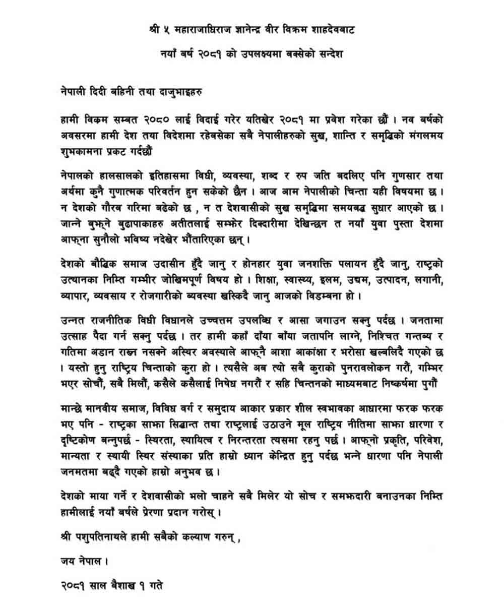 उनले आफ्नो सन्देशमा भनेका छन्-‘नेपालको हालसालको इतिहासमा विधि, व्यवस्था, शब्द र रुप जति बदलिए पनि गुणसार तथा अर्थमा कुनै गुणात्मक परिवर्तन हुन सकेको छैन। आज आम नेपालीको चिन्ता यही विषयमा छ। न देशको गौरब गरिमा बढेको छ, न त देशवासीको सुख समृद्धिमा समयबद्ध सुधार आएको छ। जान्ने बुझ्ने बुढापाकाहरु अतीतलाई सम्झेर दिक्दारीमा देखिन्छन् त नयाँ युवा पुस्ता देशमा आफ्ना सुनौलो भविष्य नदेखेर भौंतारिएका छन् ।’