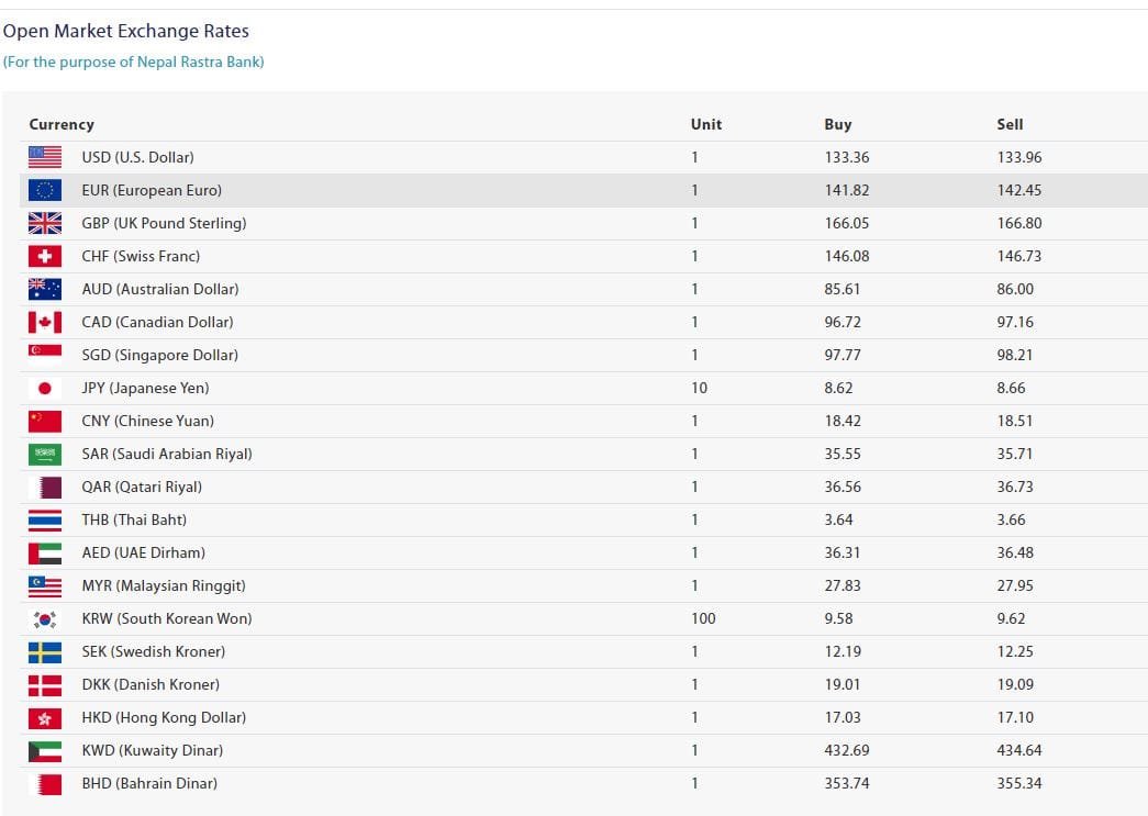 आज अमेरिकी डलरको खरिद दर १३३ रुपैयाँ ३६ पैसा र बिक्री दर १३३ रुपैयाँ ९६ पैसा कायम हुदाँ युरोपियन युरो एकको खरिद दर १४१ रुपैयाँ ८२ पैसा र बिक्री दर १४२ रुपैयाँ ४५ पैसामा कारोबार गर्न सकिनेछ ।