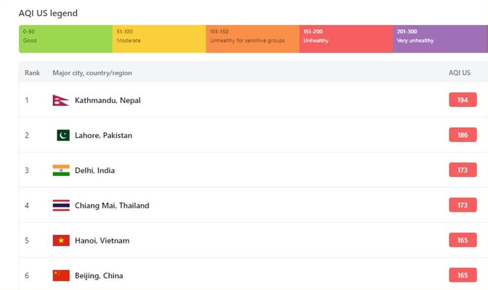 त्यस्तै दोस्रो स्थानमा पाकिस्तानको लाहोर शहर रहेको छ । लाहोर १८६ एक्यूआईसहित दोस्रो स्थानमा छ भने भारतको दिल्ली १७३ एक्यूआईसहित तेस्रो स्थानमा रहेको छ ।