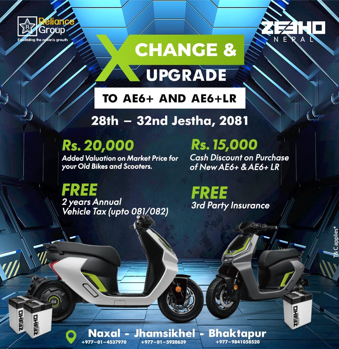 काठमाडौं । सीएफमोटो तथा जीहो ब्रान्डको नेपालका लागि आधिकारिक वितरक ऋषि ट्रेड सेन्टरले ‘एक्सचेन्ज एन्ड अपग्रेड’ नामक ५ दिने सट्टापट्टा क्याम्प सञ्चालनमा ल्याएको कम्पनीले बताएको छ । कम्पनीले नक्साल, सल्लाघारी तथा झम्सिखेलस्थित शोरुमबाट यो सेवा ग्राहकहरुलाई उपलब्ध गराउँदै छ । जीहोको एई ६ प्लस, एई६ प्लस एलआर (डबल ब्याट्री) र एई ८ मोडल हाल उपलब्ध छन् ।