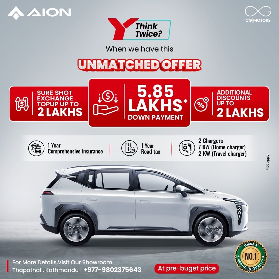 काठमाडौँ । जि ए सी मोटर्सका अधिकृत बिक्रेता सि जी मोटर्सले आयोन वाइ को खरिदमा बेजोड अविश्वसनीय अफरको घोषणा गरेको छ, जसले ग्राहकहरूलाई सुपथ मूल्य र सुविधा प्रदान गर्ने कम्पनीले बताएको छ । हालै नेपालमा विक्री वितरण सुरु भएको आयोन वाइ अब केवल रु ५.८५ लाखको न्यूनतम डाउन पेमेन्टमा उपलब्ध गराईएको छ, जसले यस एस.यू.भी.लाई निकै पहुँचयोग्य बनाएको कम्पनीको दाबी छ ।