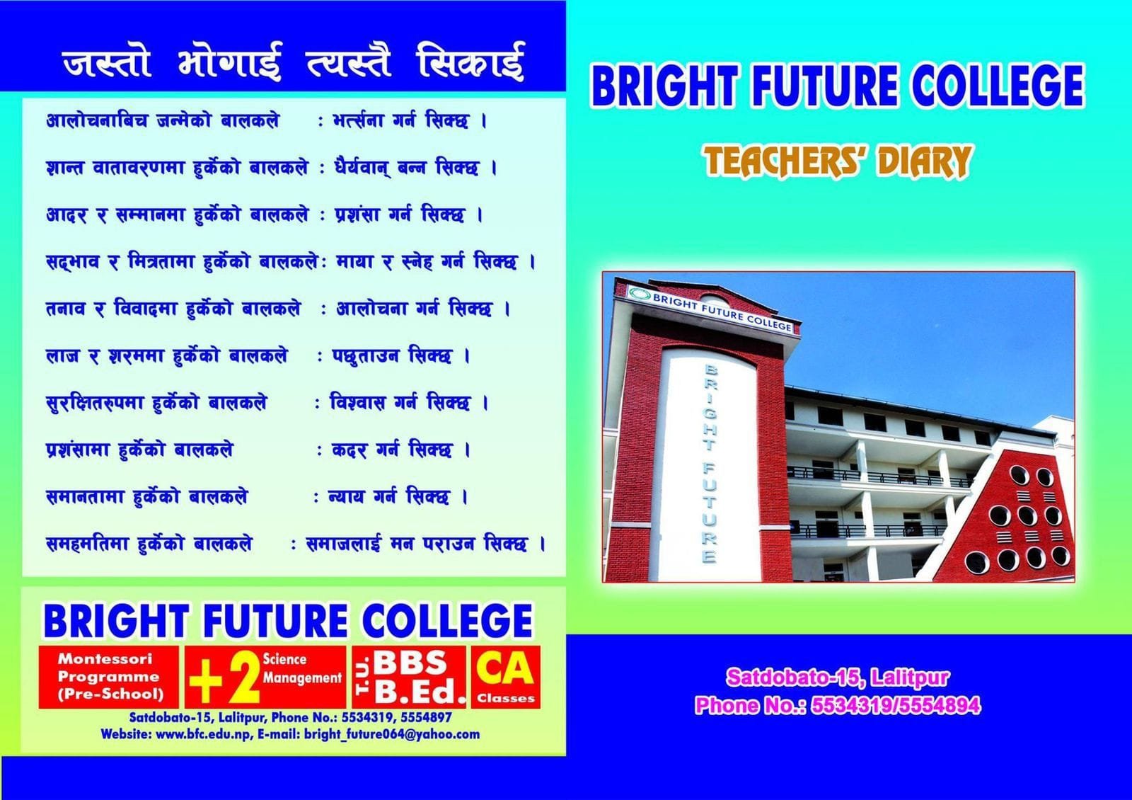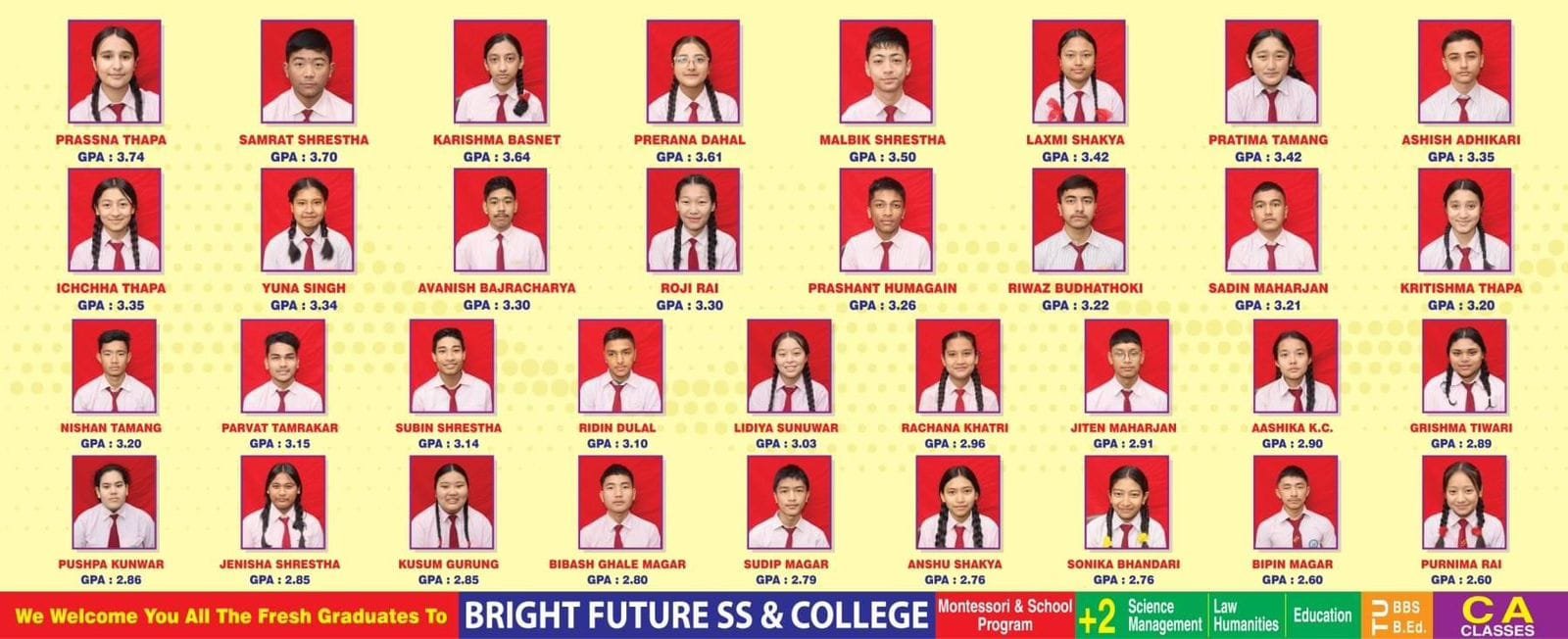 पछिल्लो समय अभिभावक र विद्यार्थीहरुको रोजाइमा पर्दै आएको ब्राइट फ्युचर स्कूल एण्ड कलेजले गुणस्तरीय शिक्षामा अव्वल रहेको प्रमाणित गरेको छ । उक्त स्कूलबाट गत वर्ष १ जना विद्यार्थीले ४.० जीपीए प्राप्त गरेकोमा यस वर्ष २ जना विद्यार्थीहरुले ४.० जीपीए प्राप्त गरेका छन् । एसईई परीक्षा वि.सं. २०८० चैत १५ गतेदेखि २७ गतेसम्म भएको थियो । देशभरका २ हजार ६४ परीक्षा केन्द्रबाट ५ लाख ४ हजार ४ सय १४ जना विद्यार्थीहरु सहभागी भएका थिए । नियमिततर्फ ४ लाख ६७ हजार र ग्रेड वृद्धितर्फ २१ हजार विद्यार्थीहरु सहभागी भएका थिए । करिब ८ हजार विद्यार्थीहरु परीक्षामा अनुपस्थित रहेको बोर्डले जनाएको छ ।