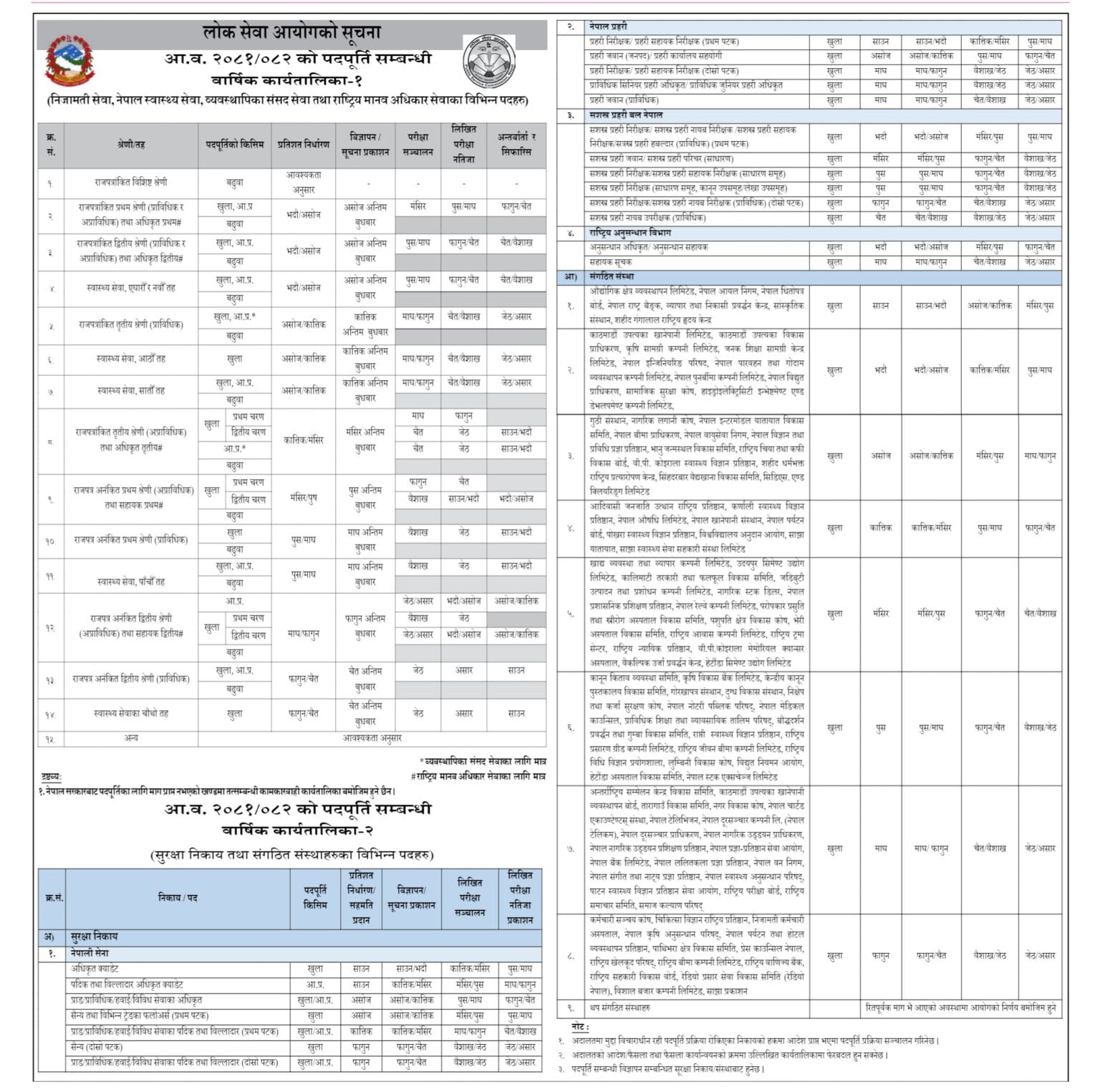 कार्यतालिका अनुसार राजपत्रांकित प्रथम र द्वितीय श्रेणीको विज्ञापन असोजको अन्तिम बुधबार प्रकाशित हुनेछ । त्यस्तै, राजपत्रांकित तृतीय श्रेणीको कात्तिक अन्तिम बुधबार, राजपत्र अनंकित प्रथम श्रेणीको पुस अन्तिम बुधबार विज्ञापन आह्वान हुनेछ ।