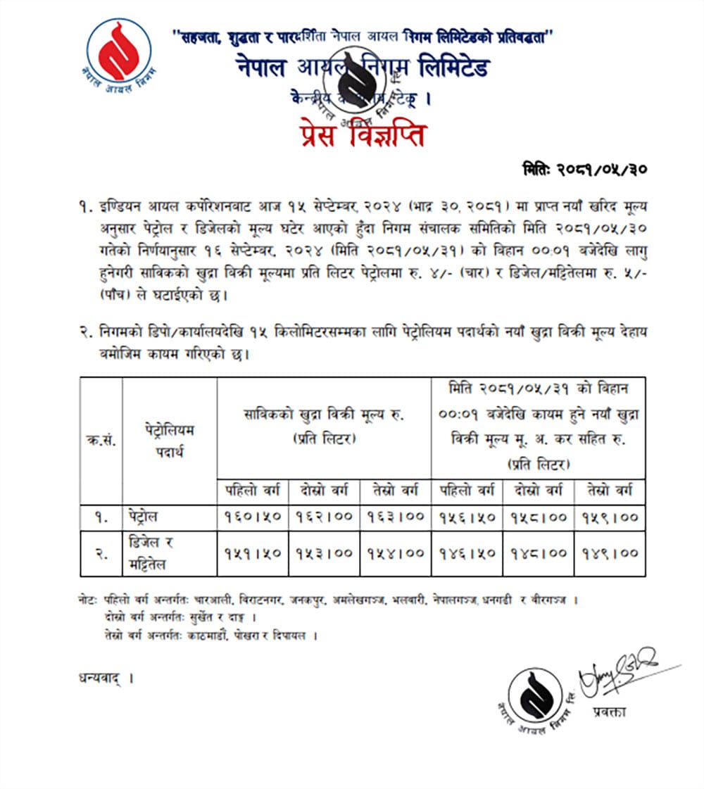 निगमले घटेको मुल्य आइतबार राति १२ बजेदेखि लागि हुने निगमले जनाएको छ ।