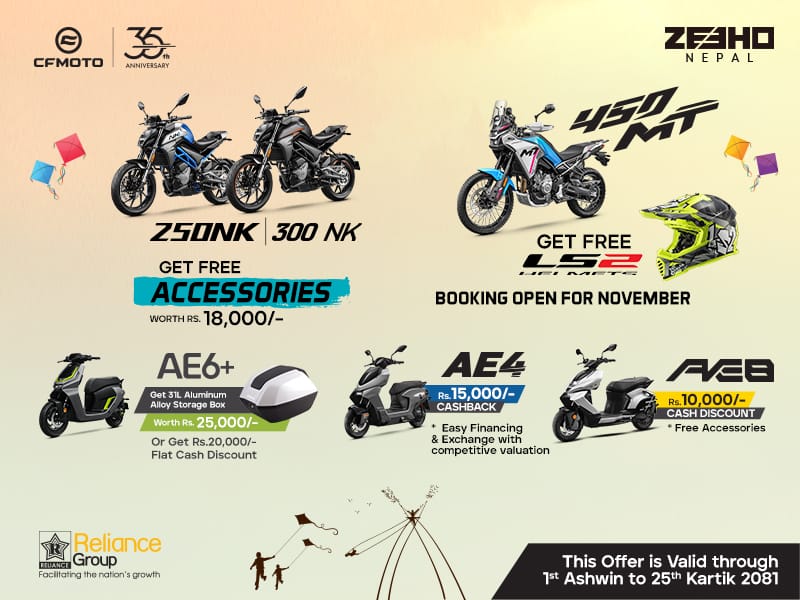सिएफमोटो र जिहो ब्रान्डको चाडपर्व अफर सार्वजनिक, बाइक र इलेक्ट्रिक स्कुटर किन्दा छुटै छुट