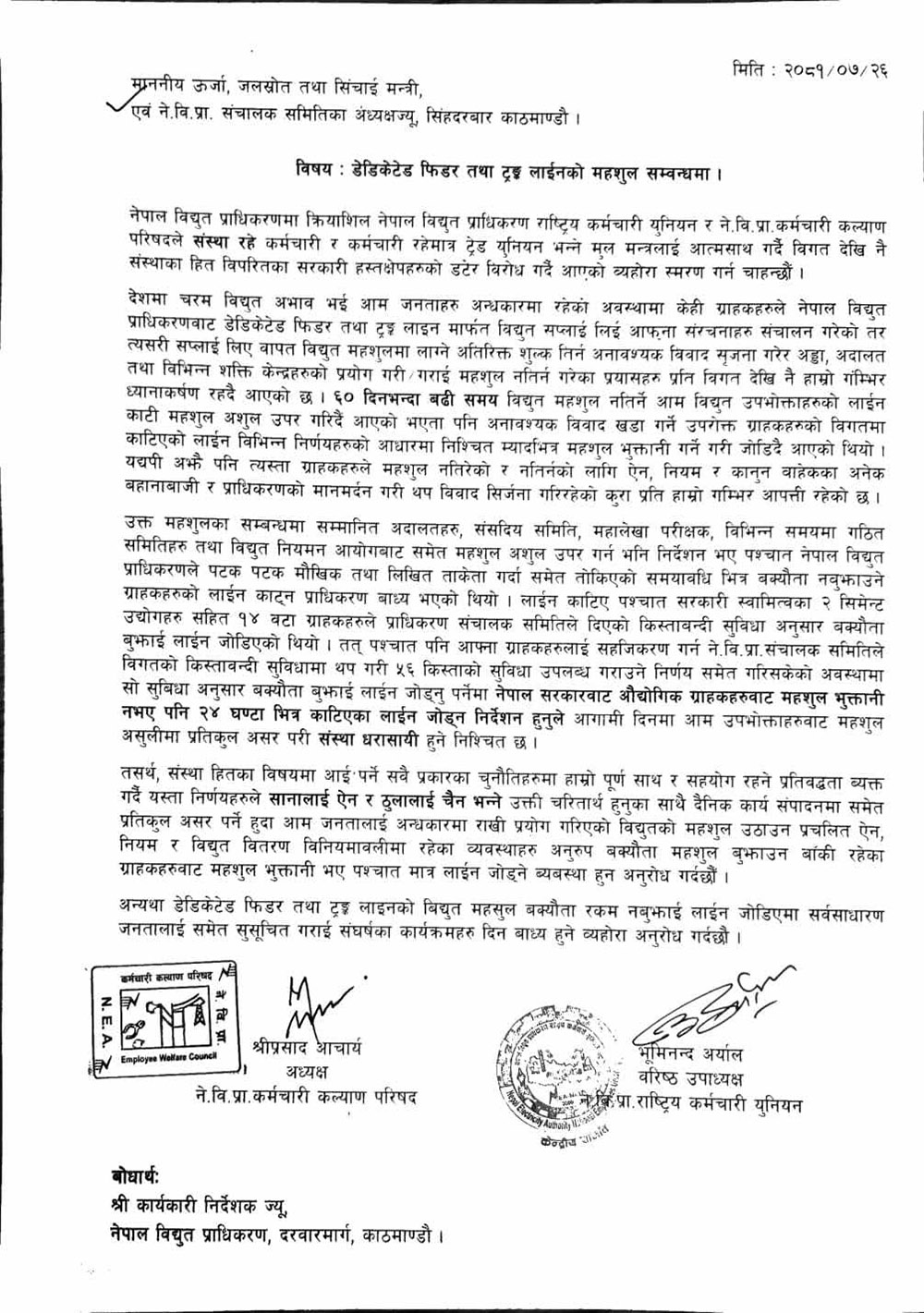 परिषद्का अध्यक्ष श्रीप्रसाद आचार्य र युनियनका वरिष्ठ उपाध्यक्ष भूमिनन्द अर्यालले हस्ताक्षर गरेको पत्रमा भनिएको छ- ‘लाइन काटिएपश्चात् सरकारी स्वामित्वका २ सिमेन्ट उद्योगसहित १४ वटा ग्राहकले प्राधिकरण सञ्चालक समितिले दिएको किस्ताबन्दी सुविधाअनुसार बक्यौता बुझाई लाइन जोडिएको थियो। आफ्ना ग्राहकहरूलाई सहजीकरण गर्न सञ्चालक समितिले सुविधामा थप गरी ५६ किस्ताको सुविधा उपलब्ध गराउने निर्णयसमेत गरिसकेको अवस्थामा सो सुविधाअनुसार बक्यौता बुझाई लाइन जोड्नुपर्नेमा सरकारबाट २४ घण्टाभित्र लाइन जोड्न निर्देशन हुनुले आगामी दिनमा आम उपभोक्ताबाट महशुल असुलीमा प्रतिकूल असर परी संस्था धराशयी हुने निश्चित छ ।’