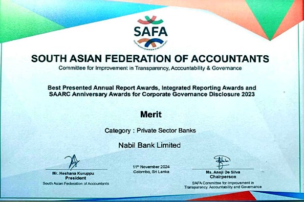 दक्षिण एसियाका निजी क्षेत्र बैंकिङतर्फ आर्थिक वर्ष सन् २०२२/२३ को वित्तीय प्रतिवेदनका आधारमा नबिल बैंकको वित्तीय पारदर्शिता, जबाफदेहिता तथा सुशासनको लागि यो अवार्ड प्रदान गरिएको साफाले जनाएको छ ।
