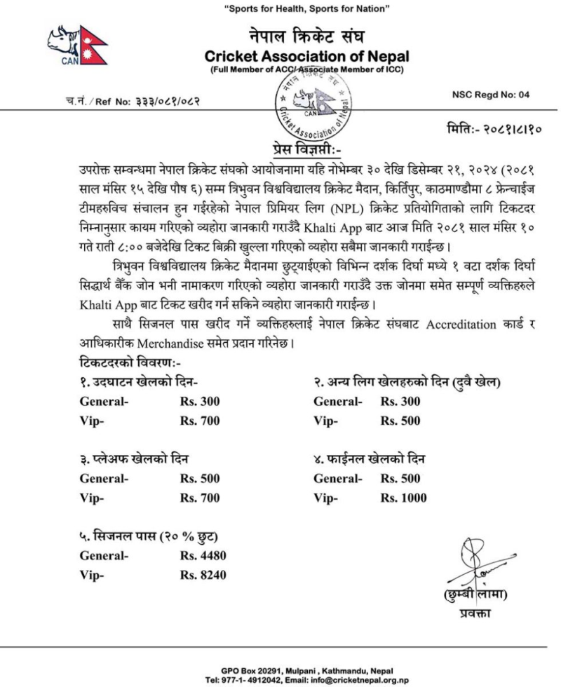 साथै क्यानले सिजनल पासमा २० प्रतिशत छुट दिदै जनरलका लागि ४ हजार ४८० र भिआइपीमा ८ हजार २४० तोकेको छ । क्यानले मङ्सिर १० गतेदेखि नै टिकट बिक्रि शुरु गरिएको जनाएको छ । टिकट खल्ती एपबाट अनलाइन खरिद गर्न सकिने व्यवस्था मिलाइएको छ ।
