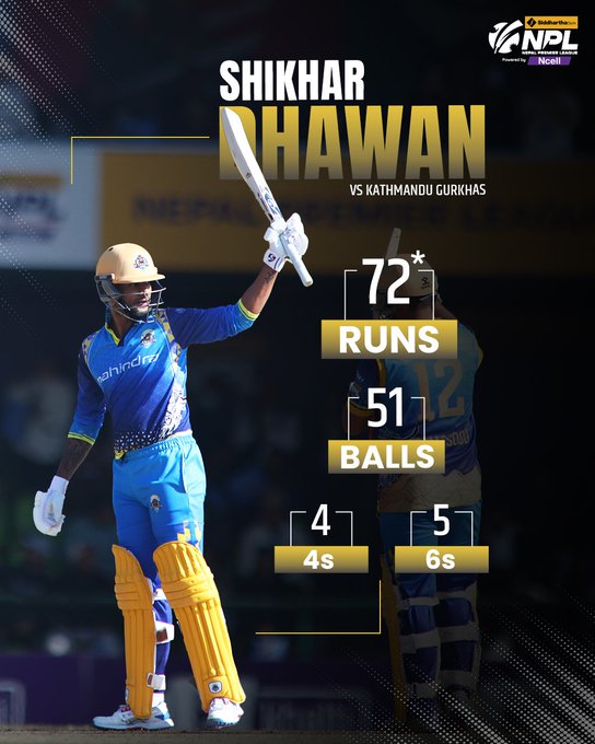 अघिल्लो खेलमा १४ रन मात्रै बनाएर बाहिरिएका भारतीय क्रीकेटर शिखर धवनको उत्कृष्ट प्रदर्शनसँगै काठमाडौंले १५० रनको लक्ष्य पाएको हो । आजको खेलमा कर्णालीका धवनले ५१ बलमा अविजित ७२ रन जोडन सफल भएका छन् ।