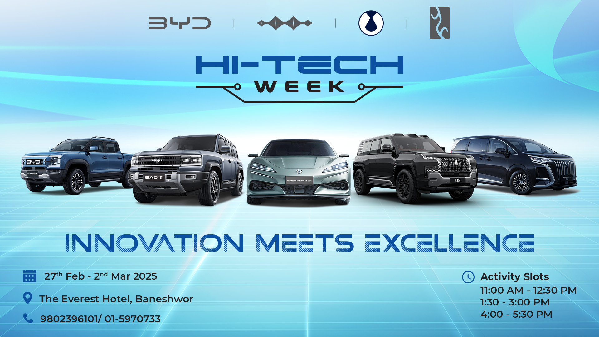 बीवाईडी हाई–टेक विक २०२५ एउटा प्रदर्शनी मात्र नभई एउटा ल्यान्डमार्क इभेन्ट हुनेछ, जसले ईभी टेक्नोलोजी, एआई इन्टिग्रेसन र न्यु इनर्जी सोलुसनलाई एउटै छानामुनि ल्याउने जनाइएको छ । शिक्षा दिने, संलग्नता बढाउने र प्रेरणा प्रदान गर्ने उद्देश्यका साथ डिजाइन गरिएको सो इभेन्ट औद्योगिक व्यवसायी, ईभी प्रयोगकर्ता, प्रविधि उत्साही र सामान्य व्यक्ति सबैका लागि पुग्नै पर्ने स्थल हुनेछ ।