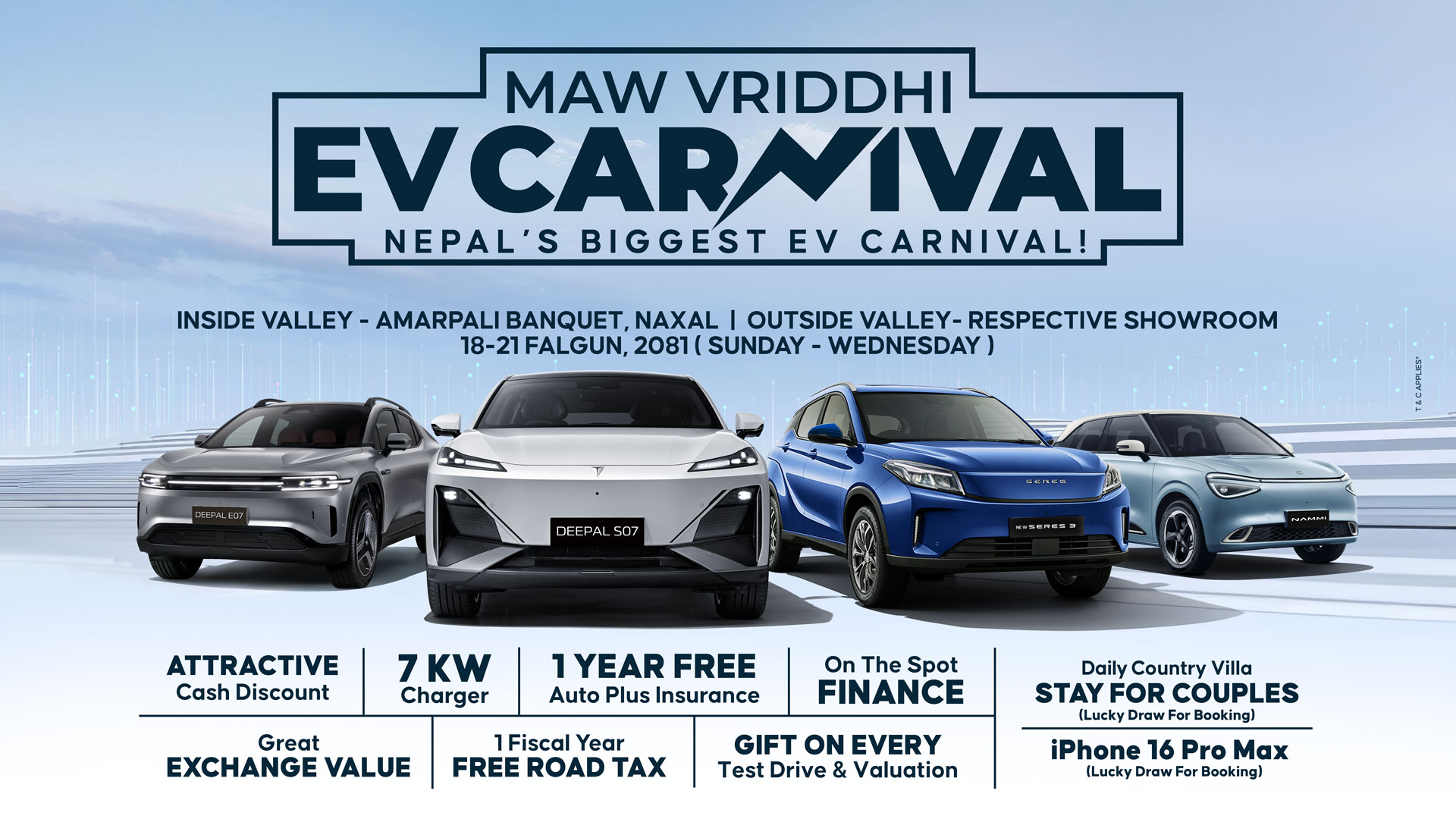 काठमाडौं । नेपालमा दिपाल, नामी र सेरेसको आधिकारिक वितरक एमएडब्लू वृद्धिले नेपालको सबैभन्दा ठूलो ईभी कार्निभल आयोजना गर्ने भएको छ। यो कार्यक्रम काठमाडौं उपत्यकाको अमरपाली बैंक्वेट, नक्सालमा फागुन १८ देखि २१ गतेसम्म (आइतबारदेखि बुधबारसम्म) बिहान ११ :०० बजेदेखि साँझ ६:०० बजेसम्म दैनिक सञ्चालन हुनेछ। साथै, उपत्यका बाहिरका सम्बन्धित शोरुमहरूमा पनि यो कार्निभल आयोजना हुने बताइएको छ।