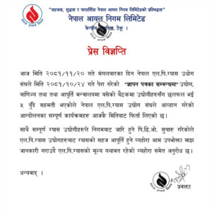 आज भएको पाँच बुँदे सहमति अनुसार उद्योगीको माग अनुसार ग्यासमा प्रति सिलिण्डर १२ रुपैयाँ ७५ पैसा बढाउने सहमति भएको थियो । तर निगमले भने ग्यासको मुल्य यथावत रहने स्पष्ट गरेको छ ।