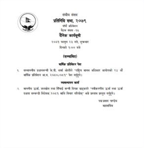 व्यवस्थापन कार्य अन्तर्गत आज उर्जामन्त्री दिपक खड्काले ‘ नवीकरणीय उर्जा तथा उर्जा दक्षता सम्बन्धि विधेयक २०८१ माथि विचार गरियोस भन्ने प्रस्ताव पेश गर्ने कार्यसूची रहेको छ ।