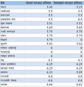 गत बैशाखमा यस्तो ब्याजदर ५.९७९५ प्रतिशत विन्दु थियो । बैशाखको तुलनामा जेठमा बैंकहरुको यस्तो ब्याजदर ०.०२७५ प्रतिशत विन्दु घटेको हो ।