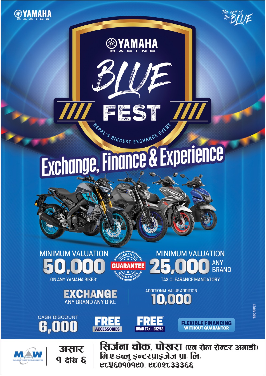यामाहा ब्लू फेस्ट केवल सवारी साधन एक्सचेन्ज कार्यक्रम मात्र होइन, यो सवारी संस्कृतिको उत्सव पनि हो, जसमा इनोभेसन, फन र कम्युनिटी बीचको सम्बन्ध मिसिएको बताइएको छ। त्यसैले तपाईं आफ्नो बाइक अपग्रेड गर्न खोजिरहनुभएको छ अथवा केवल फेस्टिभलको मजा लिन चाहनुहुन्छ भने, यो हप्ता यामाहा ब्लू फेस्ट पोखरा नै तपाईंको लागि सहि गन्तव्य हुन सक्छ।