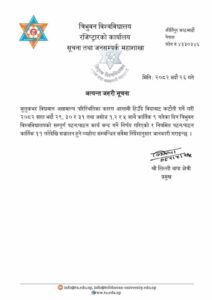 विश्वविद्यालय रजिष्ट्रारको कार्यालयका सूचना तथा सम्पर्क महाशाखाका प्रमुख लिल्लीथापा क्षेत्रीले सूचना सार्वजनिक गर्दै लामो समय बिदा दिइएको जानकारी गराएका हुन्।