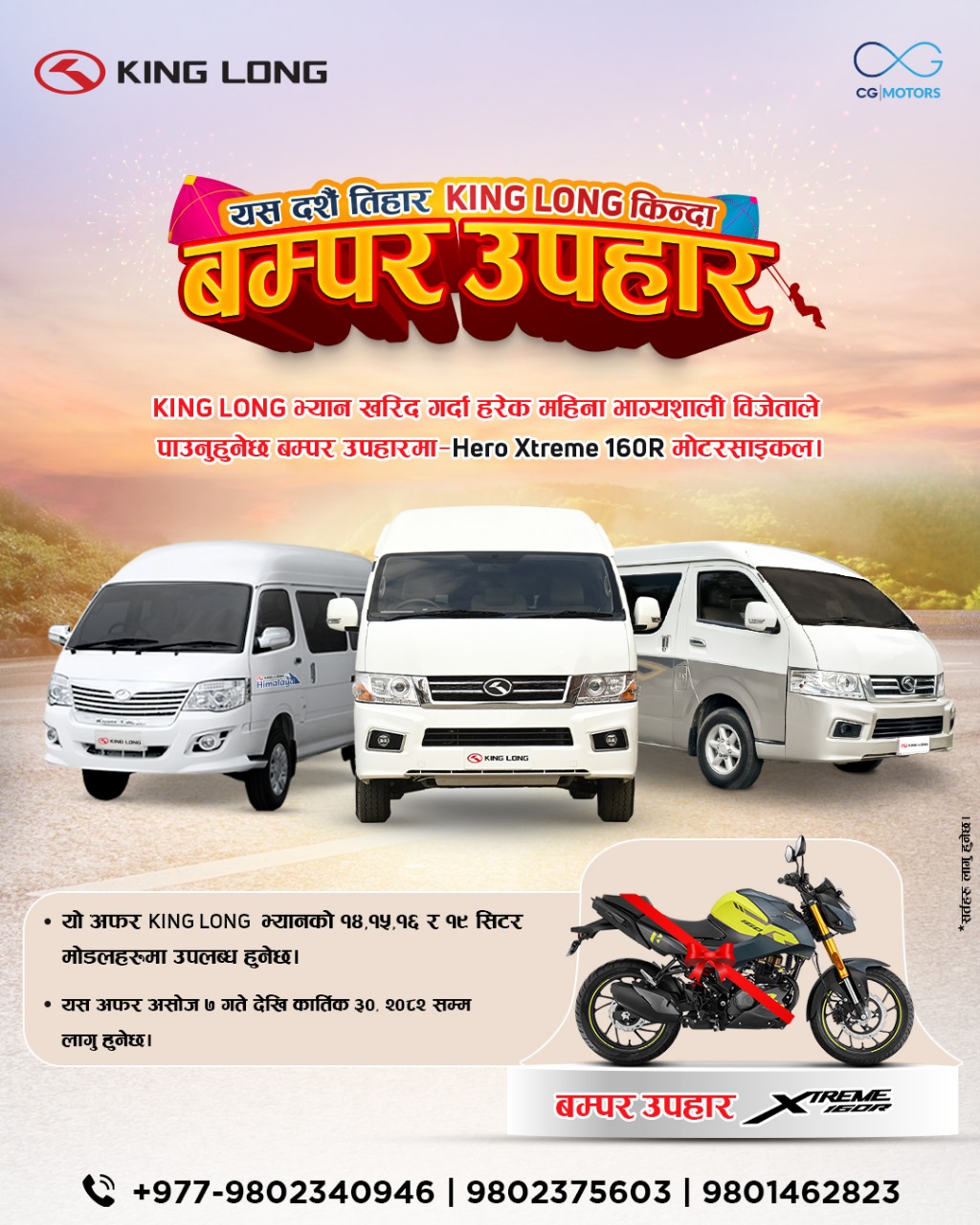 यस अवसरमा, किङ लङ इभी भ्यान खरिद गर्ने प्रत्येक ग्राहक मध्ये प्रत्येक महिनामा एक जना भाग्यशाली विजेताले हिरो एक्स्ट्रीम १६०आर मोटरसाइकल उपहार स्वरूप पाउनेछन्। यो अफर किङ लङका १४, १५, १६ र १९ सिटर भ्यान मोडेलहरूमा लागू हुनेछ। योजना असोज ७ देखि कात्तिक ३०, २०८२ सम्म सञ्चालनमा रहनेछ ।
