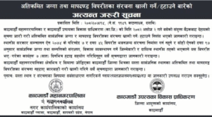 गत असोज २ गते बसेको संयुक्त बैठकको निर्णय अनुसार आज सार्वजनिक सूचना जारी गरी अतिक्रमित क्षेत्र खाली गर्न निर्देशन दिइएको हो। काठमाडौं महानगरपालिका क्षेत्रभित्र र काठमाडौं जिल्लाका सिमानासम्मका सार्वजनिक स्थानहरूमा रहेका अतिक्रमित तथा मापदण्ड विपरीतका संरचना निर्धारित समयभित्र नहटाए कानुनी कारबाही गरिने जनाएको छ।