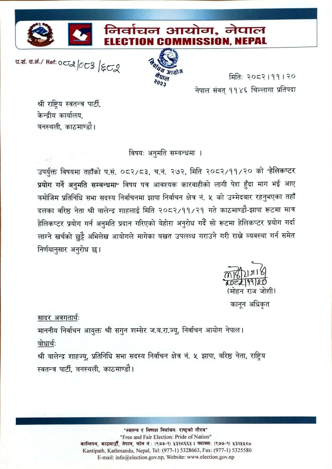 काठमाडौँ । झापा ५ का प्रतिनिधि सभाका उम्मेदवार बालेन्द्र शाह चढेको हेलिकप्टर काठमाडौँ मै फिर्ता आएको सन्दर्भमा निर्वाचन आयोगको अनुमतिनै नलिई झापा जान लागेको हुनाले बालेनलाई फर्काइएको भन्ने समाचार भ्रामक भएको खुलेको छ । यसअघिनै निर्वाचन आयोगले बालेनलाई हेलिकप्टरमा झापा जान अनुमति दिएको अनुमति पत्र यस्तो थियो ।