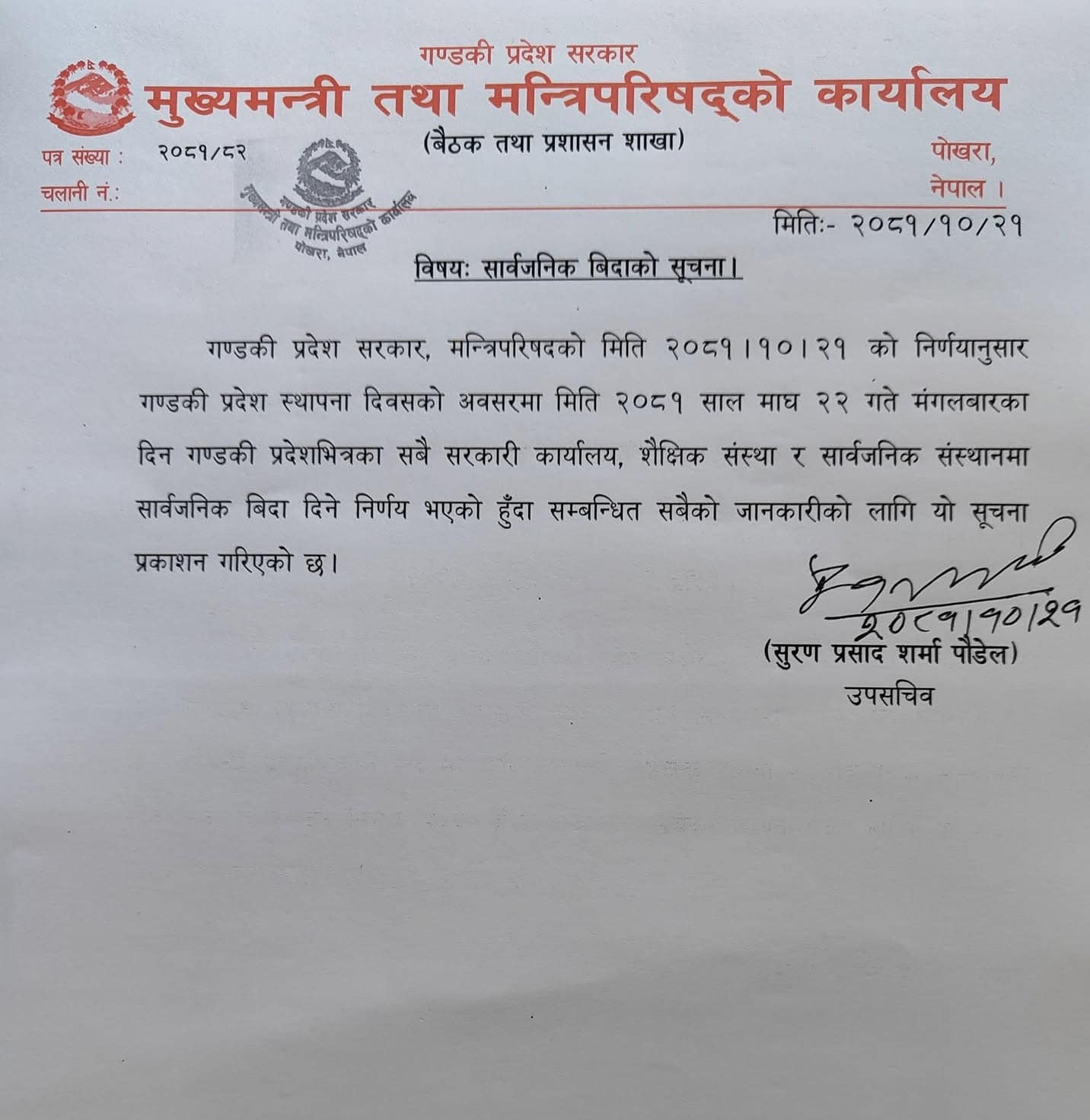 भोली गण्डकी प्रदेशमा सार्बजनिक बिदा