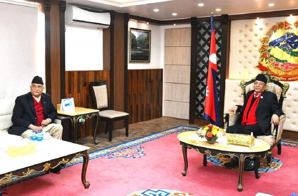 प्रधानमन्त्री प्रचण्डलाई भेट्न एमाले अध्यक्ष ओली बालुवाटारमा