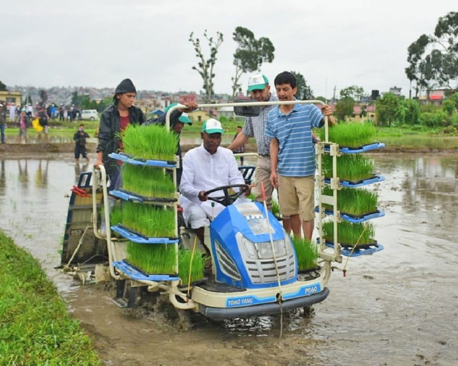 खुमलटारमा मन्त्रीले मेसिनले रोपे धान
