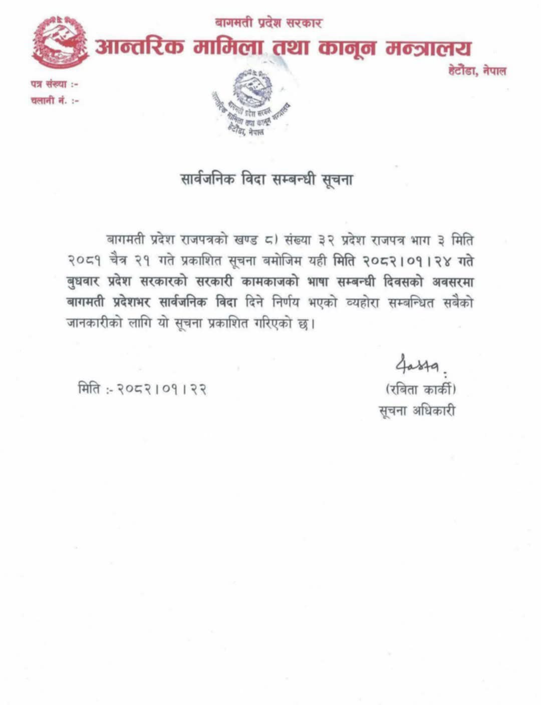 बागमती प्रदेशमा आज सार्बजनिक बिदा