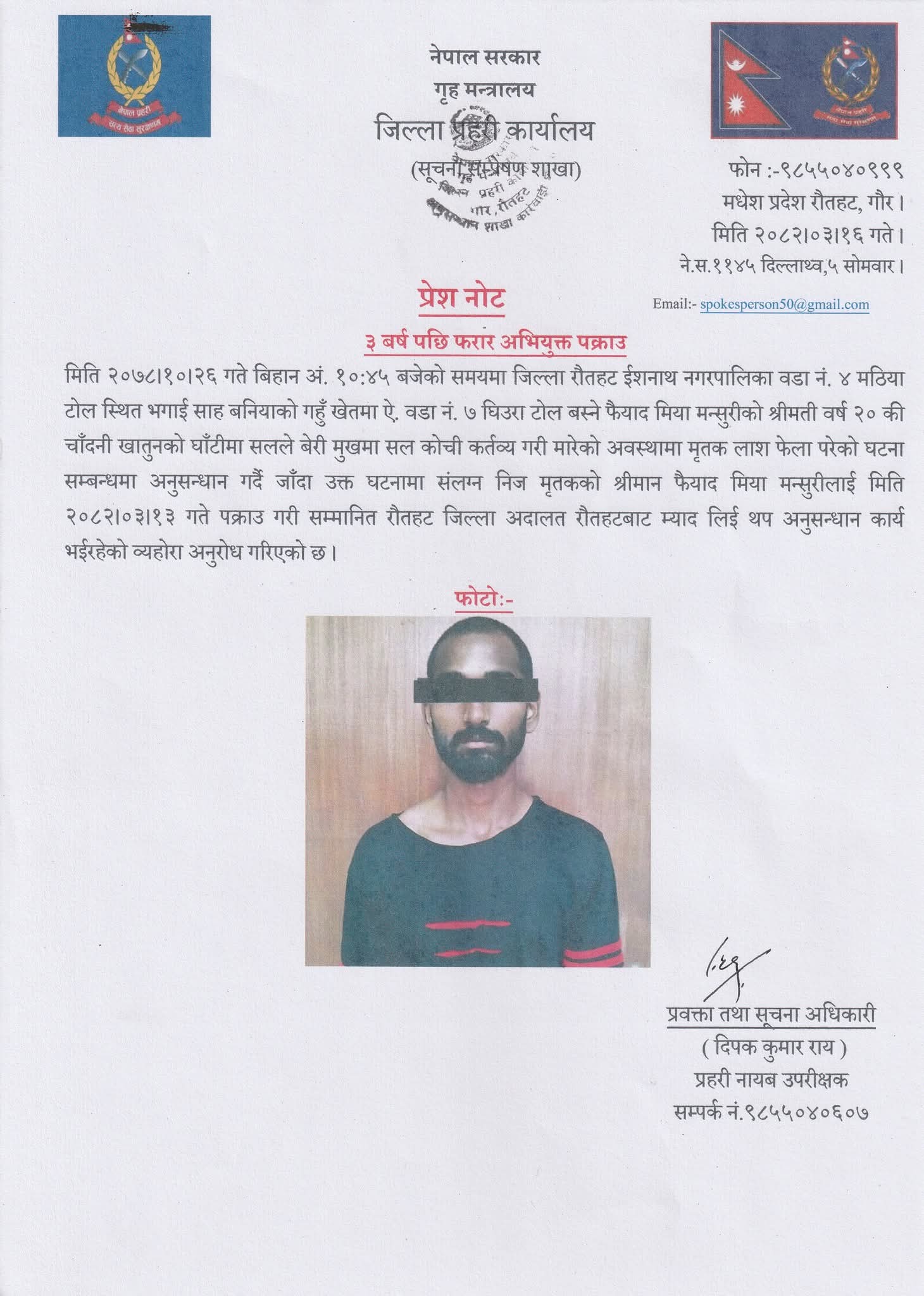 आफ्नै श्रीमतीको हत्या गरि फरार ३ बर्ष