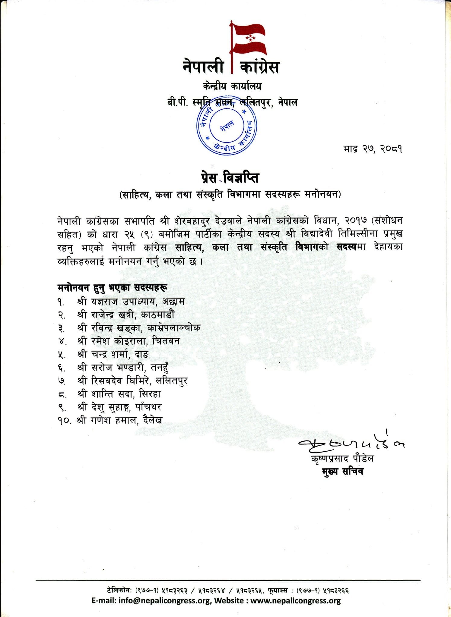 कांग्रेसको साहित्य, कला तथा संस्कृति विभागमा १०